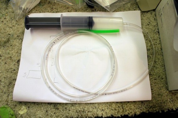So first you need a source of pressure and suction. Nothing works better than a BIG syringe hooked up to plastic tubing. Mine was a