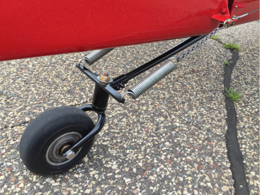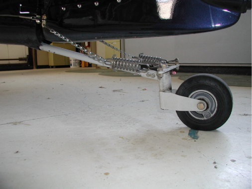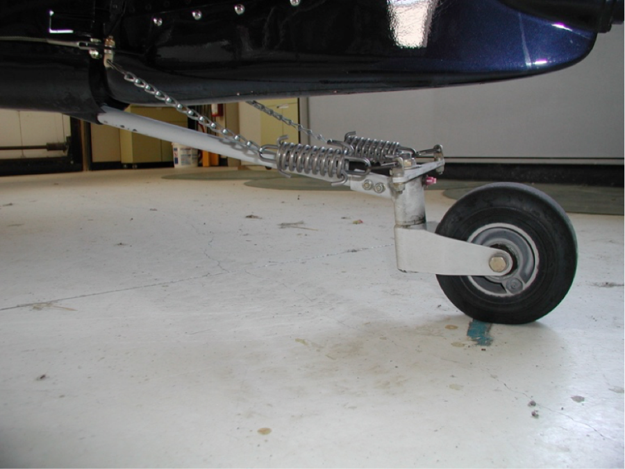 The design is simple and light and handles well. It steers easily and is full swiveling through the use of a small spring loaded pin that unlocks when a large side load is imposed. As the wheel moves back straight, the pin slides back into place on the steering arm and you can steer it straight ahead with rudder. The downside is that you can catch the front of the tailwheel fork if you taxi from grass to pavement.