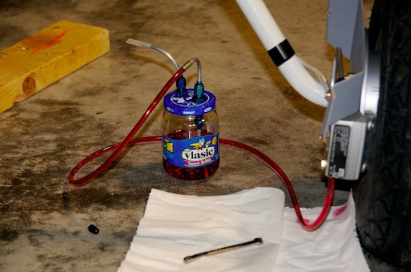 Peter Fruehling and I had just finished installing his brake system and needed to fill it. I decided this time to find another method. Buying a pressure bleeder was out of the question due to my
