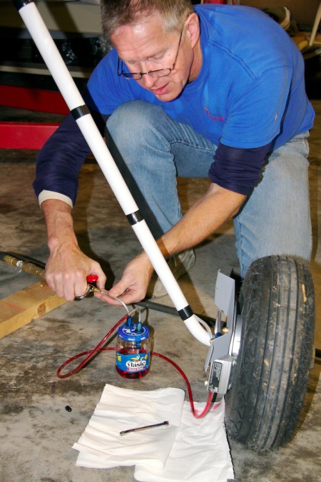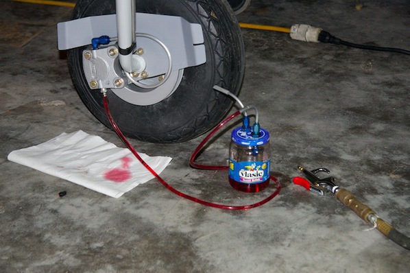 precise metering of air, but what the heck. The worse that would happen is I over pressurized the jar and brake fluid would spray all over Peters fuselage and the hangar floor. I was OK with that