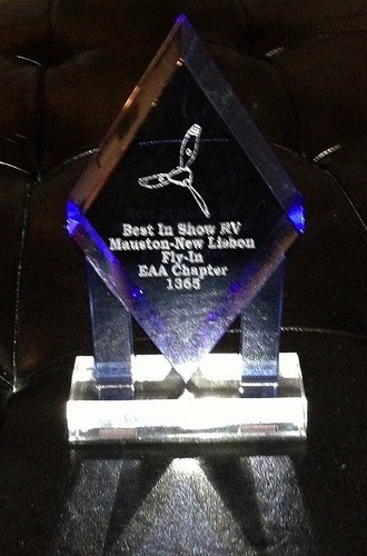 The highlight (so far, anyway) occurred one evening last fall when I got home from work. I took one of my airport buddies to a pancake breakfast in New Lisbon WI after looking online to see where such a breakfast might be happening. When we got there, they asked for the particulars and also contact information for the pilot for the RV judging they were doing. When I got home from work this past Wednesday, I had a box that contained this! While I question the judgement of those looking the aircraft over - there were several really *NICE* RVs there - I am really humbled/honored that they would send this to me!